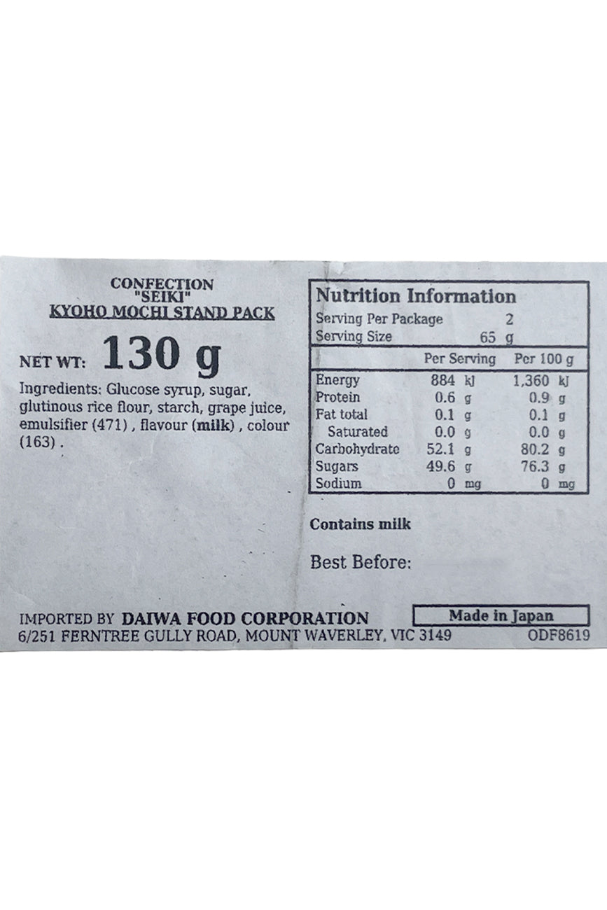 巨峰果汁を練り込んだもっちり食感のお餅です。個包装タイプになっております。食間のおやつだけでなく、お土産としてもオススメです。