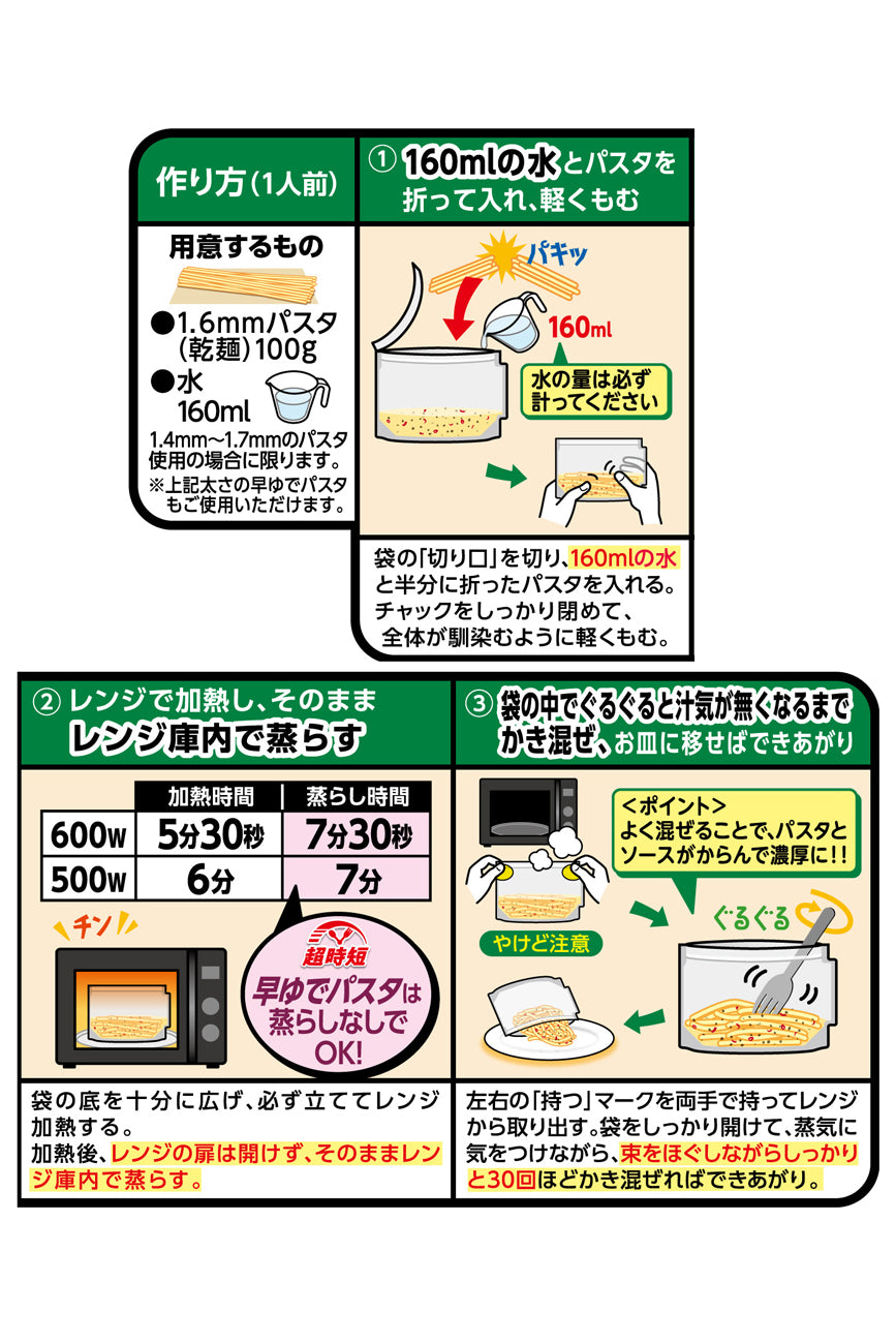 パウチの中にコップ一杯(160ml)の水とパスタを“パキッ”と折って入れ、電子レンジでチン(加熱)するだけで、パスタの茹でとソースの温めが同時にできる“パスタソース”です。※特許番号「7381803号」