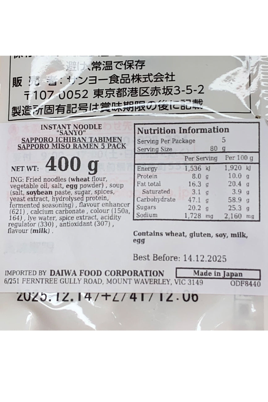 SANYO Sapporo Ichiban Tabimen Sapporo Miso Ramen 400g (5pcX80g)
