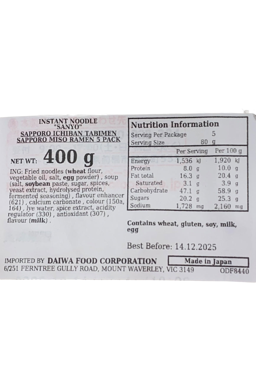SANYO Sapporo Ichiban Tabimen Sapporo Miso Ramen 400g (5pcX80g)