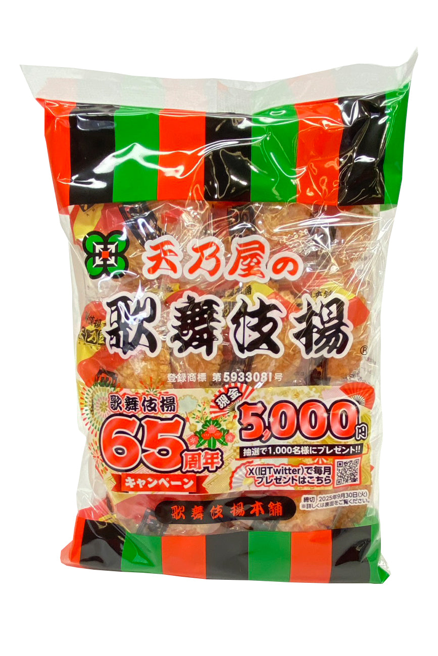 香ばしく揚げた歌舞伎の家紋入り生地に天乃屋秘伝の甘口しょうゆタレで味付けした風味豊かな揚げせんべい。サクサクとしたソフトな食感です。